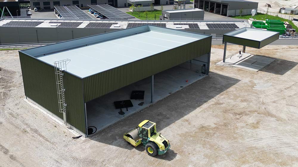 Ein besonderes Merkmal dieses Objekts sind zwei Unterzüge, durch die es möglich war die Säulen an der offenen Längsseite Seite auf nur eine zu reduzieren. Dadurch ist eine uneingeschränkte Zufahrt und das problemlose Rangieren mit großen Arbeitsmaschinen möglich – ein wesentlicher Faktor für den Auftraggeber.