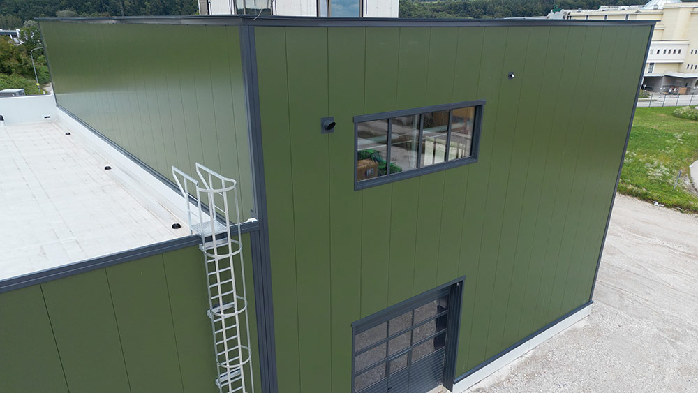 Das zentrale Gebäude des Projekts ist eine Stahlhalle mit Flachdach, die funktional und optisch mit der neu aus Beton errichteten Bürohalle verbunden ist. Die gemeinsame Fassade wurde mit Fassadenpaneelen ausgeführt, die sowohl an der Betonhalle als auch an der gesamten Stahlhalle montiert wurden. Auf diese Weise konnte trotz unterschiedlicher Tragkonstruktionen ein einheitliches Erscheinungsbild realisiert werden.
