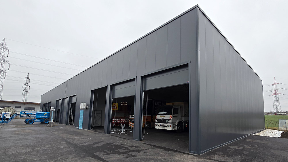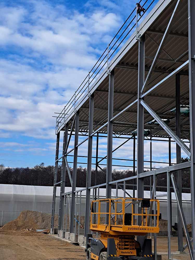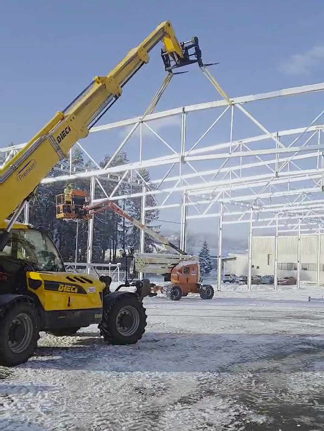 V zahtevnejših vremenskih razmerah skrbimo, da dela še naprej potekajo varno in po planu. Po celi Sloveniji montiramo raznovrstne objekte za naročnike iz različnih panog; panelne hale za Readyonset d.o.o. Maksim d.o.o. in Porenta Trade d.o.o. ter šotorske hale Schwarzmann X z ravno streho za Daro d.o.o., Fist d.o.o. in Avtocenter Stavanja d.o.o.
